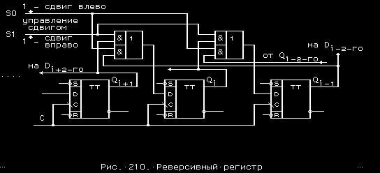 В последовательных регистрах принципиально необходимо, чтобы новый сигнал на выходе Q ш-го триггера возникал только после окончания синхросигнала. Для выполнения этого условия в последовательных регистрах необходимо применять двухступенчатые триггеры. При действии каждого очередного тактового импульса код, содержащийся в регистре, сдвигается на один разряд. Для схемы, приведенной на рис.209, сдвиг кода происходит вправо (в сторону младших разрядов). Действительно, сигнал выхода Q i+1-го триггера действует на вход D i-го триггера, а сигнал выхода Q i-го триггера действует на вход D i-1-го триггера. При действии синхросигнала i-й триггер примет состояние i+1-го, а i-1-й - состояние i-го триггера, т.е., произойдет сдвиг кода вправо на один разряд. Параллельный двоичный код одновременно снимается с выходов Q триггеров. Для сдвига кода влево необходимо, чтобы сигнал с выхода Q i-1-го триггера подавался на вход Q i-го (старшего) триггера. Реверсивные регистры должны содержать логические схемы управления, обеспечивающие прохождение сигнала с выхода Q i-го триггера на вход D i-1-го триггера при сдвиге кода вправо и прохождение этого же сигнала на вход D i+1-го при реализации сдвига кода влево. Схема построения реверсивного регистра приведена на рис. 210.