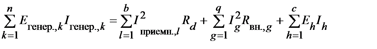 для контура 3 3 При составлении уравнений (6) – (8) со знаком плюс записаны те слагаемые, в которых ток и ЭДС имеют направления, совпадающие с направлением обхода контура. Решая систему уравнений (4) – (8), можно определить все пять неизвестных токов. Если в результате решения этих уравнений получаются отрицательные значения токов, то это значит, что истинные направления токов в ветвях цепи противоположны тем направлениям, для которых составлялись уравнения. Правильность расчёта токов в ветвях электрической цепи может быть проверена с помощью уравнения баланса мощностей источников и приёмников электрической цепи (энергетического баланса). Баланс мощностей непосредственно вытекает из закона сохранения энергии и гласит: В любой электрической цепи, в один и тот же момент времени арифметическая сумма мощностей на всех элементах, вырабатывающих электроэнергию (суммарная генерируемая мощность), равна арифметической сумме мощностей на всех приемниках.
