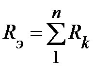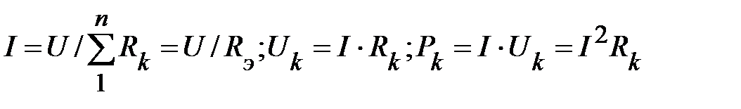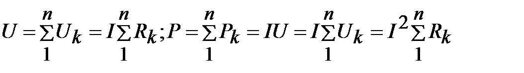 Левая часть (10) характеризует выражение для определения мощности на каждом генераторе с последующим арифметическим суммированием (только со знаком «плюс») мощностей всех генераторов цепи. Первое слагаемое в левой части представляет собой арифметическую сумму мощностей на всех «полезных приемниках» цепи, под которыми понимают совокупность потребителей «ради которых создана эта цепь». В бытовом смысле это холодильники, стиральные машины, пылесосы, телевизоры и т. д. Они потребляют электроэнергию, но в то же время совершают «полезное» для нас, какое либо действие. Второе слагаемое в правой части (10) представляет собой арифметическую сумму потерь мощности на внутренних сопротивлениях источников и сопротивлении соединительных проводов. Оно характеризует бесполезные затраты энергии при ее передачи от источника к потребителю. Многие замечали, как разогревается автомобильный аккумулятор при длительной работе или вилка мощного квартирного потребителя, вставленная в розетку. Это примеры бесполезных затрат электроэнергии, которые учитывает второе слагаемое. Третье слагаемое представляет собой арифметическую сумму мощностей на всех источниках, работающих в режиме потребителя. Например, в таком режиме работают аккумуляторы во время подзарядки. Законы Кирхгофа формируют линейные уравнения относительно токов (4) – (8), а баланс мощностей создает алгебраическое нелинейное уравнение (ток входит во второй степени). Оно является дополнительным уравнением к системе (4) – (8) и поэтому часто используется для проверки правильности расчета по уравнениям (4) – (8). Законы Кирхгофа являются фундаментальными законами и позволяют описать состояние (режим работы) любой сложной цепи. Однако на практике их использование требуется не всегда, поскольку часто встречающиеся простые цепи для своего расчета требуют знания свойств параллельного и последовательного соединения потребителей. Последовательным называется такое соединение элементов, когда условный конец первого элемента соединяется с условным началом только одного второго, конец второго – с началом только третьего и т. д. Характерным для последовательного соединения является один и тот же ток во всех элементах. Последовательное соединение нашло достаточное применение на практике. Например, последовательно с приёмником