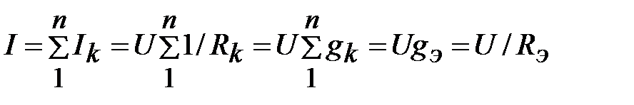 С помощью приведённых формул нетрудно выяснить характер изменения тока, напряжений и мощностей при изменении значений сопротивлений или числа включённых резистивных элементов. Например, если увеличить число элементов, то эквивалентное сопротивление возрастёт, а ток, напряжения и мощности ранее включённых элементов уменьшаются; уменьшается также и общая мощность. Самостоятельные приёмники электрической энергии последовательно, как правило, не соединяются, так как при этом требуется согласование номинальных данных приёмников, исключается возможность независимого их включения и отключения, а при выходе из строя одного из приёмников отключаются также остальные приёмники. Чаще их включают параллельно. Параллельным называется соединение элементов цепи или схемы только между двумя потенциальными узлами (рис. 10). Характерным для параллельного соединения является одно и то же напряжение Параллельное соединение применяется часто для расширения пределов измерения амперметров (рис. 11): если ток Токи и мощности параллельно соединённых ветвей (рис. 10) при