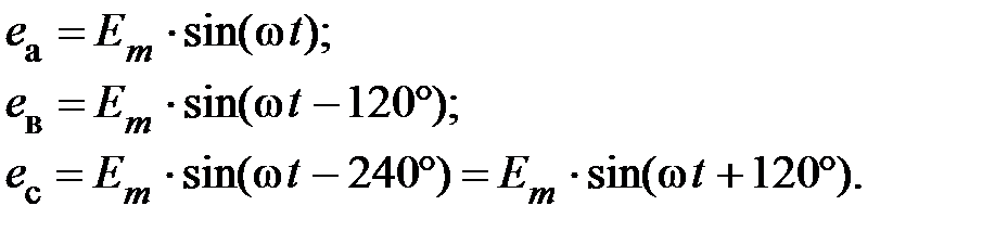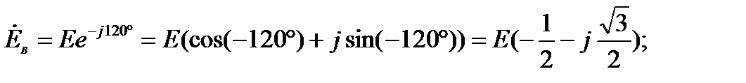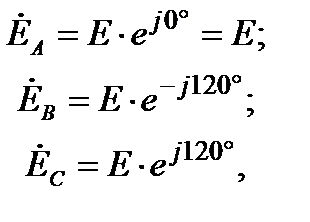 Такая система ЭДС называется трехфазной симметричной системой. Последовательность в обозначении фаз генератора, т. е. порядок чередования фаз, не может быть случайной. Например, последовательность, приведённую в (1) называют прямой последовательностью фаз. Для такой последовательности характерно, что ЭДС фазы В отстаёт от ЭДС фазы А на угол 120º, а ЭДС фазы С отстаёт от ЭДС фазы В также на угол 120º. Если поменять местами любые две фазы, то полученная новая последовательность будет называться обратной последовательностью фаз. Соотношение (1) можно представить в комплексной форме