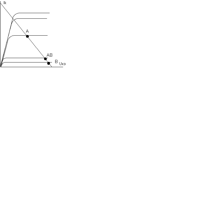 Основным назначением выходного каскада является передача в нагрузку максимальной и необходимой мощности, близкой к предельной для данного типа транзистора, при наименьшем потреблении мощности от источника питания и допустимых уровнях искажений. Поэтому выходной каскад это каскад мощности. Основными показателями такого каскада являются: · Отдаваемая в нагрузку мощность, · К.П.Д., · Уровень нелинейных искажений и допустимая частота пропускания. Нелинейные искажения и К.П.Д. зависят от начальной точки покоя транзистора. Поэтому важным при выборе выходного каскада является режима работы. При больших сигналах нелинейные искажения могут возникать как из-за нелинейности входных, так и выходных характеристик транзисторов. Основываясь на проведенных рассуждениях можно, по выходным характеристикам транзисторов рис. 4.1. показать, что усилители могут быть трех классов 1. А - точка покоя выбирается такой, что при движении по линии нагрузки она не выходит ни в одну нелинейную зону. 2. В - точка покоя находится в крайнем правом положении на характеристике Iб=0. Таким образом, такой усилитель усиливает только одну полуволну входного сигнала. Как правило, такие усилители работают по двухтактной схеме. 3. АВ - Промежуточный класс, он позволяет снизить нелинейность, но не устраняет ее полностью. При жестких требованиях к нелинейным искажениям выходные каскады работают в классе А. Высокий К.П.Д. можно получить в классах В, АВ. Как правило, выходное сопротивление усилителей мощности велико, а сопротивление нагрузки мало и поэтому в каскадах используется трансформаторная связь, что позволяет получить высокие значения неискаженной мощности. При трансформаторном включении нагрузки постоянная составляющая выходного тока не протекает через нагрузку, что уменьшает расход потребляемой мощности питания и повышает К.П.Д.