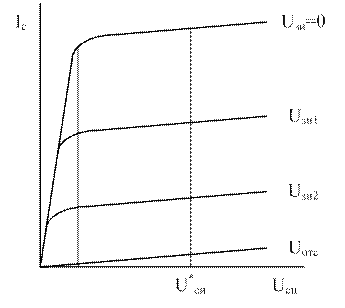 На рис.3.2а внешнее напряжение приложено только к входной цепи транзистора. Изменение напряжения Uзи приводит к изменению проводимости канала за счет изменения на одинаковую величину его сечения по всей длине канала. Но выходной ток Iс = 0, поскольку Uси = 0. Рис.3.2б иллюстрирует изменение сечения канала при воздействии только напряжения Uси (Uзи = 0). При Uси > 0 через канал протекает ток Iс, в результате чего создается падение напряжения, возрастающее в направлении стока. Суммарное падение напряжения участка исток — сток равно Uси. В cилу этого потенциалы точек канала n-типа будут неодинаковыми по его длине, возрастая в направлении стока от нуля до Uси. Потенциал же точек p-области относительно истока определяется потенциалом затвора относительно истока и в данном случае равен нулю. В связи с указанным обратное напряжение, приложенное к p-n переходам, возрастает в направлении от истока к стоку и p-n переходы расширяются в направлении стока. Данное явление приводит к уменьшению сечения канала от истока к стоку. Повышение напряжения Uси вызывает увеличение падения напряжения в канале и уменьшение его сечений, а, следовательно, уменьшение проводимости канала. При некотором напряжении Uси происходит сужение канала, при котором границы обоих p-n-переходов смыкаются и сопротивление канала становится высоким. На рис.2.3 в отражено результирующее влияние на канал обоих напряжений Uзи и Uси. Канал показан для случая смыкания p-n переходов. Управление шириной p-n перехода (или, что то же самое толщиной канала), обедненного подвижными носителями заряда, осуществляется электрическим полем, возникшим в запирающем слое без инжекции носителей. Так как управление сечением канала идет по участку затвор-исток обратно включенного p-n перехода, то входное сопротивление транзистора оказывается очень большим, что выгодно отличает ПТ от биполярного транзистора. При прямом включении p-n перехода (Uзи>0) возникает относительно большой ток затвора, и сопротивление участка З-И резко уменьшается, поэтому применять такое включение не целесообразно. При Uзи, равном напряжению отсечки Uотс, обедненный слой полностью перекрывает канал, и ток стока Iс становится равным току утечки Iут обратно включенного p-n перехода. При подключении источника питания Uси в цепи между электродами С и И протекает ток Iс, величина которого определяется проводимостью канала, и создает падение напряжения вдоль канала, тем самым расширяя обедненный слой в канале от С к И. Увеличение Uси вызывает увеличение Iс, что приводит к дальнейшему расширению обедненного слоя и снижению проводимости канала. Напряжение Uси, при котором резко сокращается увеличение Iс, называется напряжением насыщения Uси нас, при Uзи=0 Uси нас числено совпадает с напряжением отсечки. Uотс - напряжение, при котором в сечении около стока должно произойти перекрывание канала. Но перекрывание канала и отсечки тока не происходит, т.к. образуется горловина канала с критическим значением напряженности электрического поля. С увеличением Uси горловина удлиняется, за счет чего критическое значение напряженности в горловине канала остаётся постоянным. Таким образом, происходит не отсечка, а лишь ограничение тока Iс нач=const, т.е. начальный ток стока Iс нач становится независимым от напряжения Uси. Напряжение Uси нас, при котором происходит о