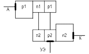 Обычный тиристор (рис.4.1а) является силовым электронным не полностью управляемым ключом. Он имеет четырехслойную p-n-p-nструктуру с тремя выводами анод (А), катод (К) и управляющий электрод (У). Структуру тиристора можно представить в виде двух соединенных трехслойных структур: p-n-p и n-p-n, эквивалентных биполярным транзисторам (рис.4.1б).