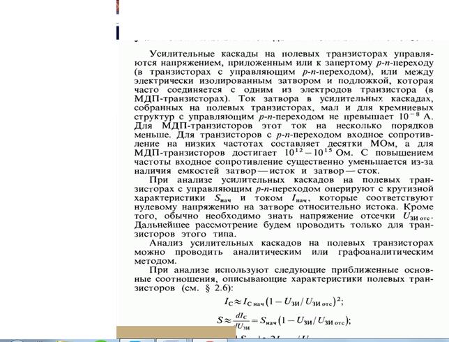 Принцип построения усилительных каскадов на полевых транзисторах тот же, что и каскадов на биполярных транзисторах. Отличительная особенность состоит в том, что полевой транзистор управляется по входной цепинапряжением, а не током. Поэтому задание режима покоя в каскадах усиления на полевых транзисторах осуществляется подачей во входную цепь каскада постоянного напряжения соответствующей величины и полярности. Полевые транзисторы, так же как и биполярные имеют три схемы включения. В соответствии с названиями электродов различают каскады с общим стоком (ОС), общим истоком (ОИ) и общим затвором (ОЗ). Каскад ОЗ обладает низким входным сопротивлением, поэтому имеет ограниченное практическое применение.