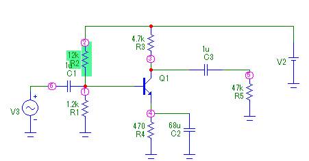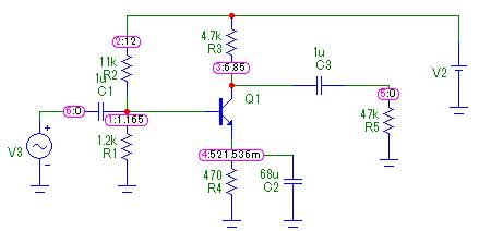 Рис. 1. Выбираем модель транзистора 2N2218. Значения источника напряжения V2 устанавливаем на 12 В, а источника напряжения V3: A=10M, F=1KHZ. Используем анализ по постоянному току DC. Чтобы транзистор был в активном режиме и работал в классе А установим на коллекторе напряжение, примерно равное V2/2, т.е. около 6 В. Для этого изменяем значение сопротивления R2 на 11 кОм, при котором напряжение на коллекторе составляет 6,85 В (рис. 2).