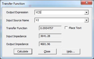 Рис. 4 Выходное сопротивление может быть найдено с использованием анализа Transfer Function (малосигнальная передаточная функция) в опции Analysis. Результат показан на рис. 5.