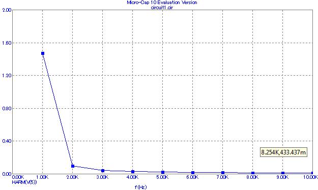 Рис. 5 Для определения коэффициента гармоник воспользуемся оператором обработки сигналов при построении графиков HARM(u) – расчет гармоник сигнала u. Используем анализ Transient. Результат моделирования представлен на рис. 6 и на рис. 7.