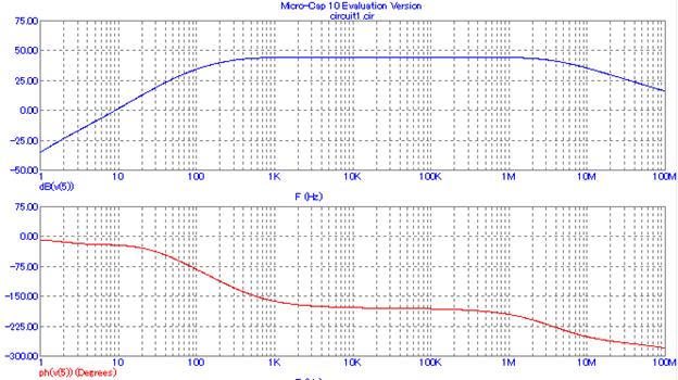 3. Моделирование амплитудно – частотной (АЧХ) и фазочастотной (ФЧХ) характеристик Исследуем усилитель на рис. 2. Запустим анализ частотных характеристик АС. Результат показан на рис. 8.