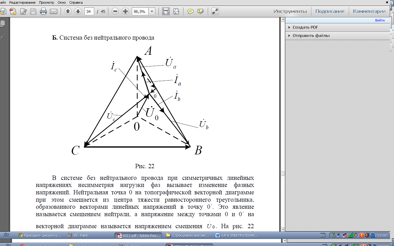 Рис. 3 В системе без нейтрального провода при симметричных линейных напряжениях несимметрия нагрузки фаз вызывает изменение фазных напряжений. Нейтральная точка 0 на топографической векторной диаграмме при этом смещается из центра тяжести равностороннего треугольника, образованного векторами линейных напряжений в точку называется смещением нейтрали, а напряжение между точками 0 и векторной диаграмме называется напряжением смещения показана векторная диаграмма напряжений и токов для несимметричной нагрузки фаз (Rа < Rb < Rc) при отсутствии нейтрального провода. Геометрическая сумма векторов токов здесь равна нулю, что соответствует выражению (2). При симметричной нагрузке фаз смещения нейтральной точки не происходит. Напряжение