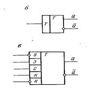 Триггер – генератор прямоугольных импульсов c двумя длительно устойчивыми состояниями равновесия. переключение триггера из одного длительно устойчивого состояния равновесия в другое происходит под действием внешнего сигнала. RS-триггер- триггер, который сохраняет своё предыдущее состояние при нулевых входах и меняет своё выходное состояние при подаче на один из его входов единицы. D-триггер – триггер задержки, имеет один информационный вход. Повторяет входной сигнал с задержкой на такт. Т-триггер – счетный триггер, имеющий один информационный вход. Триггер меняет свое состояние на противоположное с приходом информационного сигнала. JK-триггер универсальный триггер, так как с помощью внешней коммутации его можно превратить в триггер, выполняющий функции RS, T, D- триггеров. По 2-му рис: б) Т – триггер; в) JK - триггер
