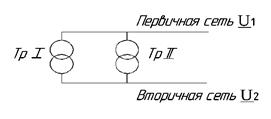 При параллельной работе первичные обмотки трансформаторов получают энергию от общего источника, а вторичные обмотки подключаются к общему приемнику (рис.5.27). Для нормальной работы в режиме параллельного соединения трансформаторы должны отвечать следующим условиям: 1. коэффициенты трансформации всех трансформаторов должны быть равны, т.е. К1 = К2=…Кn.(разница значений коэффициента трансформации не должна превышать 50%). 2. трансформаторы должны иметь одинаковые: v номинальные первичные и вторичные напряжения, v напряжения короткого замыкания uK1= uK2=…=ukn (допускается отклонение ±10%) 3. все трехфазные трансформаторы должны иметь одну и ту же группу соединений(0 или 11). Если трансформаторы принадлежат к разным группам соединения обмоток, то между векторами линейных вторичных ЭДС (а, следовательно, и напряжений) сдвиг фаз будет отличаться от 00, а их векторная разность не будет равна нулю. На рис.5.28 показана векторная диаграмма линейных вторичных ЭДС трансформаторов, принадлежащих к нулевой и одиннадцатой группам соединения обмоток.