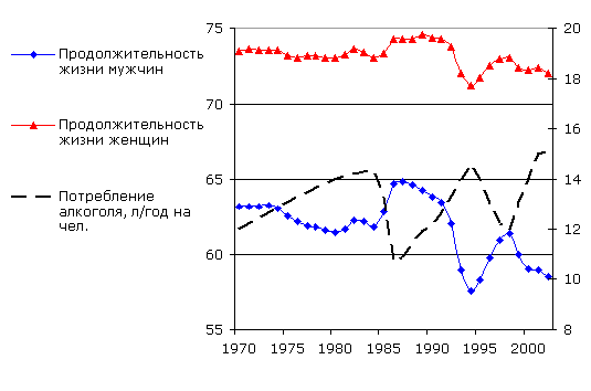 Диаграмма 2. Динамика потребления алкоголя и продолжительности жизни мужчин и женщин в России в 1970−2005 гг.