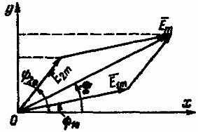 Рис. 2. Графическое сложение двух синусоидальных ЭДС одинаковой частоты Сумма проекций вращающихся векторов E1m и E2m на ось ординат равна проекции на ту же ось вектора Em, являющегося их геометрической суммой. Следовательно, при сложения двух синусоидальных ЭДС одной и той же частоты получается синусоидальная ЭДС той же частоты, амплитуда которой изображается вектором Em, равным геометрической сумме векторов E1m и E2m: Em = E1m + E2m.