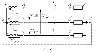 Различают два вида соединений: в звезду и в треугольник. В свою очередь при соединении в звезду система может быть трех- и четырехпроводной. Соединение в звезду На рис. 6 приведена трехфазная система при соединении фаз генератора и нагрузки в звезду. Здесь провода АА’, ВВ’ и СС’ – линейные провода.