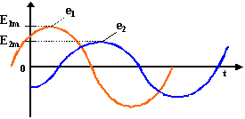 Рисунок 2.3 - Графическое изображение синусоидальных напряжений Запишем синусоидальные напряжения с помощью тригонометрических функций: Значения в скобках синуса называют фазами синусоид, а значения фазы в начальный момент времени - начальной фазой. Величина ω называется угловой частотой: Где Т - период [c]; f - частота [Гц]. При совместном рассмотрении двух синусоидально изменяющихся величин одной частоты разность их фазовых углов, равную разности начальных фаз, называют углом сдвига фаз: Если α=0, то говорят, что сигналы синфазны, если α=π, то говорят, что сигналы в противофазе. Если α=+π/2 - в квадратуре. Т.е. е2 отстаёт от е1 на угол α. При изображении синусоидальных ЭДС, напряжений и токов вращающимися векторами на декартовой плоскости из начала координат проводят векторы, равные амплитудным значениям синусоидальных величин, и вращают эти векторы против часовой стрелки с угловой скоростью ω. Фазовый угол отсчитывают от положительной оси абсцисс.