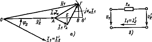 Зависимость напряжения на вторичной обмотке трансформатора от тока нагрузки U 2 = f (I 2) при U 1 = const и cos φ2 = const называется внешней характеристикой. Из уравнения (8.15) для упрощенной схемы замещения трансформатора следует, что с изменением тока во вторичной обмотке (тока нагрузки I 2) напряжение на вторичной обмотке изменяется. Значение напряжения на вторичной обмотке определяется не падением напряжения, а потерей напряжения в обмотках. Потеря напряжения есть арифметическая разность между первичным и приведенным вторичным напряжением: Δ U' 2 = U 1 - U' 2. При отсутствии нагрузки (I 2 = 0) напряжение на вторичной обмотке U' 2 = U' 20 = U 1, а поскольку напряжение U 1 не зависит от нагрузки, то Δ U' 2 есть изменение напряжения U' 2 по сравнению с его значением при холостом ходе U' 20, или Δ U' 2 = U' 20 - U' 2; Δ U 2 = U 20 - U 2, Откуда U 2 = U 20 - Δ U 2. Потеря напряжения определяется из векторной диаграммы упрощенной схемы замещения трансформатора (рис. 8.14): Δ U' 2 - U 1 - U' 2 = OB' -ОА ≈ ОВ -ОА = АВ; Δ U' 2 =I 1 r к cos φ2 + I 1 x к sin φ2 = I 1(r к cos φ2 + x к sin φ2); Δ U 2 = Δ U' 2/ n.