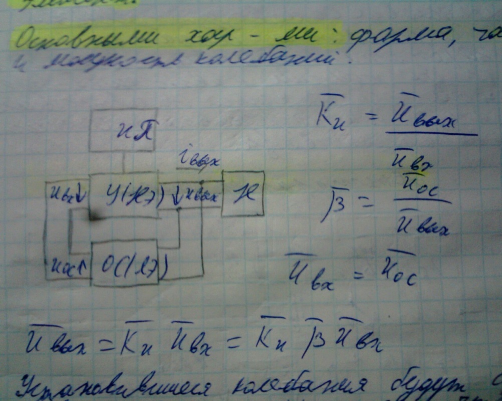 На вход усилителя через конденсатор Сб, ёмкостное сопротивление, которого на частоте генерации не значительно, поступает связи, представленный ЭДС базовой Lб. Коллекторный ток, появившийся в момент включения источника питания Un, заряжает конденсатор Ck, который затем разряжаясь на индуктивный элемент Lk, создаёт в контуре колебания с резонансной частотой. Амега0 = 1/квадр. корень Lk*Ck