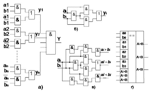 а) структурная схема (слишком много входов), б) преобразованная по законам алгебры логики схема в) схема одноразрядного компаратора. Цифровые компараторы являются универсальными элементами сравнения, которые помимо констатации равенства двух чисел, могут установить какое из них больше. Простейшая задача состоит в сравнении двух одноразрядных чисел. Схема одноразрядного компаратора приведена на рисунке 38,в. При рассмотрении принципа работы схемы следует иметь в виду, что если ai < bi, то ai = 0, а bi = 1 и наоборот. Для сравнения многоразрядных чисел используется следующий алгоритм. Сначала сравниваются значения старших разрядов. Если они различны, то эти разряды и определяют результат сравнения. Если они равны, то необходимо сравнивать следующие за ними младшие разряды, и т. д.