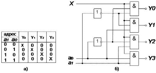 Рисунок 36 Таблица истинности — а) Пример функциональной схемы 4-канального демультиплексора — б)
