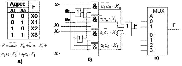 Рисунок 33 Мультиплексор 4:1 а) — Таблица истинности; б) — Функциональная схема; в) — Условное графическое обозначение. (Рисунок 33,б). Здесь адресными (управляющими) входами являются а 1, а 0, а информационными — Х0, Х1, Х2, Х3.