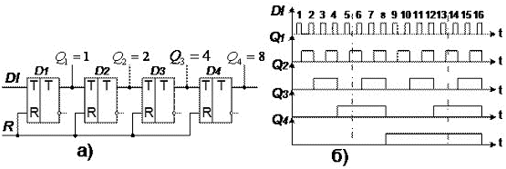 Простейшим счётчиком является Т-триггер, считающий до 2-х, то есть осуществляющий счёт и хранение не более 2-х сигналов. Счётчик, образованный цепочкой из n триггеров сможет подсчитать в двоичном коде 2n импульсов. Число n определяет количество разрядов двоичного числа, которое может быть записано в счётчик. Схема простейшего 4-х разрядного счётчика приведена на рисунке 60,а. Принцип работы счётчика проиллюстрирован временными диаграммами, приведёнными на рисунке 60,б.