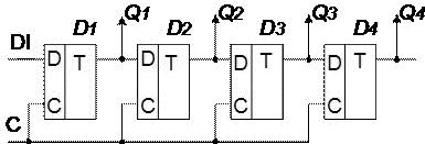 Вход «D» первого триггера служит для приёма в регистр входной информации DI в виде последовательного кода. С каждым тактовым импульсом на этот вход должен подаваться код нового разряда входной информации. С выхода «Q4» последнего триггера снимается последовательный выходной код. Параллельный выходной код можно снять с выходов Q1…Q4 всех триггеров регистра сдвига, снабдив их выходными ключами, подобными выходным ключам параллельного регистра.