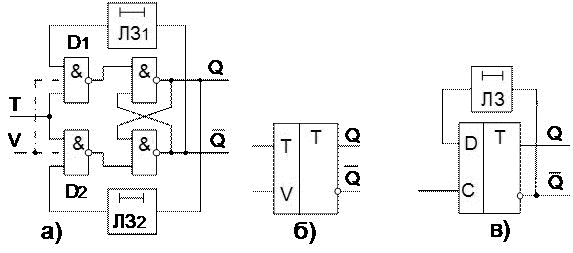 Рисунок 50 Т-триггеры: — а) структурная схема, б) УГО TV-триггера, в) Т-триггер на основе D-триггера.