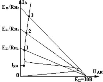 Контрольные вопросы Расчетное задание 4.3.1 Построить ВАХ тиристора: провести 3 нагрузочные линии, соединяя точку 10В на оси напряжения с точками ЕП /RН1; ЕП /RН2; ЕП /RН3 на оси тока. На нагрузочные линиях нанести точки 1, 2, 3, на расстояниях от оси тока соответственно Uак1, Uак2, Uак3. Нанести точку с координатами Uак 1; Iуд. Соединить полученные точки и получить восходящую часть характеристики, нижнюю часть характеристики снять не представляется возможным и её нужно прочертить так, как показано на рисунке 4.3.
