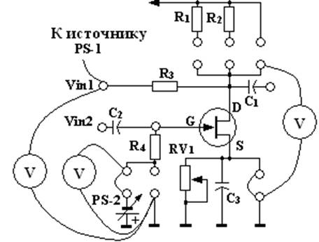 Рисунок 6.1 – Схема для снятия характеристик полевого транзистора 6.2.4 Устанавливая фиксированные напряжения на затворе Uзи, снимать зависимости тока стока от напряжения на стоке Iс = f(Uси.), изменяя напряжение источника PS-1. Данные заносить в таблицу 6.1.
