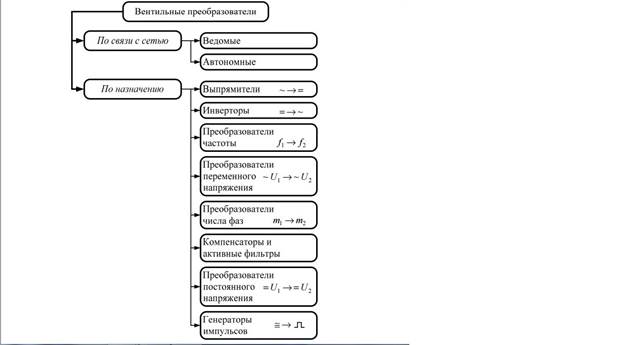 2. По назначению вентильные преобразователи делятся: а) на выпрямители, которые преобразуют переменный ток в постоянный ток; б) на инверторы, которые преобразуют постоянный ток в переменный ток; в) на преобразователи частоты, которые преобразуют переменный ток одной частоты в переменный ток другой частоты; г) на преобразователи переменного напряжения, изменяющие вели- чину переменного напряжения. При этом частота и число фаз остаются неизменными; д) на преобразователи числа фаз, изменяющие число фаз при неизменной частоте; е) на компенсаторы и активные фильтры, которые повышают качество напряжения в сети; ж) на преобразователи постоянного напряжения, изменяющие вели- чину постоянного напряжения; з) на генераторы импульсов, формирующие импульсы произвольной формы и частоты. 1.3. Состав устройств преобразовательной техники Все устройства преобразователь- ной техники состоят из силовой части и системы управления, что показано на рис. 1.2. Элементами силовой части являются: - вентили; - трансформаторы; - реакторы; - конденсаторы.