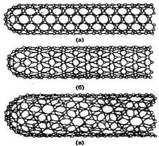 Открыты и описаны такие трубки в 1991 году японским исследователем Иижима. Диаметр таких трубок лежит от 0,5 нм до нескольких нанометров. Длина трубок может достигать десятков микрон. Из-за таких размеров углеродных трубок они и получили название нанотрубок. Одним из поразительных свойств нанотрубок является то, что их свойства зависят от их геометрии. Например трубки могут быть с открытыми концами, что позволяет заполнять их другими атомами, или с закрытыми концами. Это позволяет капсулировать объем нанотрубки. По своей структуре углеродные нанотрубки являются третьей аллотропной формой углерода. Существует ограниченное число схем, с помощью которых можно из графитового листа выстроить нанотрубку. Рассмотрим точки А и А’. Вектор, соединяющий А и А’ определяется как: Сh = na1 + ma2, где n,m - 1,2,3…. – действительные числа, а1, а2 – единичные векторы в графитовой плоскости. Трубка образуется при сворачивании графитового слоя и соединении точек А и А’. Тогда трубка определяется единственным образом вектором Сh. Диаметр трубки выражается