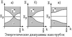 Зависимости электрических свойств нанотрубок были определены на основе квантово-механических расчетов их зонной структуры. Было отмечено, что три из четырех валентных электронов каждого атома углерода образуют локализованные σ-связи, а четвертый участвует в образовании делокализованной π-системы. Эти π-электроны слабо связаны со своими атомами, поэтому именно они могут участвовать в переносе заряда в системе. Энергетические диаграммы нанотрубок имеют следующий вид. Высокая металлическая проводимость наблюдается, если занятые π-состояния перекрываются с вакантными π*-состояниями (рис а). Расчеты показывают, что подобной структурой обладают трубки для которых разность n – m кратна трем. Остальные нанотрубки являются полупроводниковыми с шириной запрещенной зоны от нескольких десятых до примерно 2 эВ. Ширина запрещенной зоны возрастает с уменьшением диаметра нанотрубки.