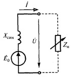 Схема замещ синхрон генератора. В нагруженном синхронном генераторе существуют три магнитных потока: Ф0 - основной поток ротора, Фя - поток статора и Фs— поток рассеяния статора. Эти магнитные потоки индуцируют в катушке фазы соответственно три ЭДС: Е0 - от магнитного потока ротора, Ея - от потока статора и Es — от магнитного потока рассеяния. Следует отметить, что ЭДС Ея и Es пропорциональны вызвавшему их току фазы статора I. Поэтому указанные ЭДС могут быть выражены в комплексной форме через фазный ток I и индуктивные сопротивления фазы: Eя = -jXя·I Es = -jXs·I где Xя, Xs- соответственно индуктивное сопротивление и индуктивное сопротивление рассеяния фазы обмотки статора. Таким образом, уравнение, составленное по второму закону Кирхгофа для фазной катушки статора, будет иметь следующий вид: E0 + Eя + Es = U + I·Rф или E0 - jXяI - jXsI = U + I·Rф или U = E0 - j(Xя + Xs)·I - I·Rф где U - фазное напряжение статора; Rф - активное сопротивление фазы статора. Сумму реактивных сопротивлений фазы называют реактивным синхронным сопротивлением и обозначают Хсин = Xя + Xs. Обычно для фазы обмотки статора Rф<<Xсин, поэтому падением напряжения на активном сопротивлении фазы можно пренебречь. Тогда уравнение для фазы статора будет выглядеть так: U = E0 - jXсинI Схема замещения фазы генератора, отвечающая уравнению, изображена на рисунке: