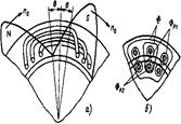 Если бы оси секций одной фазы обмотки совпадали, то результирующая ЭДС Е 1 одной фазы обмотки равнялась бы произведению ЭДС одного витка Е' на число витков фазы: (10.18) E 1 = Е'w 1 = 4,44 f 1 w 1Ф. Полученное выражение ЭДС имеет тот же вид, что и для трансформатора. Однако в связи с тем, что фаза обмотки статора состоит из нескольких секций, расположенных в разных пазах (рис. 10.13, а) и сдвинутых в пространстве на угол θ, ЭДС в каждой секции будут сдвинуты во времени также на угол θ. Вследствие этого результирующая ЭДС одной фазы обмотки будет определяться не арифметической, а геометрической суммой ЭДС секций. Поэтому в выражение (10.18) вводится поправочный коэффициент k 01, равный отношению модуля геометрической суммы ЭДС секций обмотки к арифметической сумме: k 01 = |Σ Е' |/Σ Е'. Этот коэффициент называется обмоточным. Следует отметить, что обмотки выполняются с укороченным шагом, что приводит к увеличению угла θ. Обмоточный коэффициент k 01 = 0,91÷0,95. Таким образом, расчетная формула ЭДС обмотки статора имеет вид Е 1 = 4,44 f 1 w 1Ф k 01. Как вытекает из уравнения электрического равновесия цепи статора, которое имеет тот же вид, что и уравнение первичной цепи трансформатора, U 1 = - Е 1 + I 1 r 1 + j I 1 х 1, и если пренебречь падением напряжения в обмотке статора, то ЭДС будет равна напряжению на обмотке статора: (10.19) U 1 = Е 1 = 4,44 f 1 w 1Ф k 01.