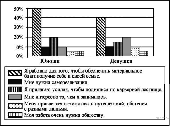 12. Задание 12 № 5517. Социологи опросили 23-летних работающих юношей и девушек страны Z. Им задавали вопрос: «Зачем Вы работаете, какова Ваша трудовая мотивация?». Полученные результаты (в % от числа опрошенных) представлены в виде диаграммы.