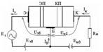 По 1 з-ну Кирхгофа для транзистора ток эмиттера равен сумме тока базы и тока коллектора: Iэ= Iб +Iк, где Iэ= Iэр +Iэрек +Iкн – ток эмиттера; Iб= Iэр +Iэрек -Iк0 – ток базы. Этот ток составляет не более 1% от тока эмиттера; Iк0 – тепловой ток коллекторного перехода. Ток коллектора равен Iк= Iк0+ Iкн, где Iкн= αIэ. Отсюда Iк= αIэ+ Iк0. Таким образом, в схемах с транзистором имеются две цепи: входная, в которую включается источник усиливаемых колебаний, и выходная, в которую включается нагрузочное сопротивление. Ток эмиттера Iэ здесь является управляющим током, ток коллектора Iк – управляемым, а ток базы Iб – их разностью.