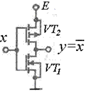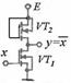 Схема инвертора на МДП. Транзистор VT1 работает в ключевом режиме, VT2 – всегда в активном. VT2 является нелинейной нагрузкой. При запертом VT1 транзистор VT2 ‑ в активном режиме, ближе к насыщению, при насыщенном VT1 транзистор VT2 – в активном, ближе к отсечке. При подаче на вход х низкого уровня напряжения VT1 запирается, VT2 близок к насыщению, на выходе ключа высокий уровень напряжения. При подаче на вход х высокого уровня напряжения VT1 отпирается, VT2 близок к отсечке, на выходе ключа низкий уровень напряжения. Выполняется операция ;