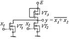 б) КМДП, если на оба входа поданы сигналы низкого уровня, то транзисторы VT 3 и VT 4 будут открыты, так как имеют канал с проводимостью р-типа, а транзисторы VT 1 и VT 2 — закрыты, так как имеют канал с проводимостью n -типа. Таким образом, на выходе установится напряжение высокого уровня (логическая единица). При подаче напряжения высокого уровня хотя бы на один из входов соответствующий транзистор VT 3 или VT 4 закроется, т.е. ток через них не течет, а транзистор VT 1 или VT 2 соответственно откроется. На выходе установится напряжение низкого уровня (логический ноль). Видно, что данная схема реализует логическую функцию ИЛИ—НЕ.