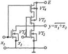 а) МДП, двухвходовой схеме ИЛИ-НЕ входные транзисторы VT1 и VT2 соединены параллельно. Если хотя бы на один из входов подан высокий уровень напряжения, соответствующий транзистор отпирается, и на выходе схемы будет низкий уровень. И только при подаче на все входы схемы низкого уровня транзисторы VT1 и VT2 запрутся, и на выходе появится высокий уровень. Выполняется операция ;