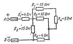 Цепь постоянного тока содержит несколько резисторов, соединённых смешено. Схема цепи с указанием сопротивлений резисторов приведена на рисунке. Всюду индекс тока или напряжения совпадает с индексом резистора, по которому проходит этот ток или действует это напряжение. Например, через резистор R3 проходит ток I3 и на нём действует напряжение U3. Напряжение на зажимах цепи UАВ=100 В. Определить ток I3. Как изменится ток I5 при замыкании накоротко резистора R1?