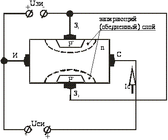 При напряжении Uзи = 0 сечение канала наибольшее, его сопротивление наименьшее и ток Iс получается наибольшим. Ток стока Iс нач при Uзи = 0 называют начальным током стока. Напряжение Uзи, при котором канал полностью перекрывается, а ток стока Iс становится весьма малым (десятые доли микроампер), называют напряжением отсечки Uзи отс.