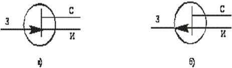 Рисунок 2 – Условное обозначение полевого транзистора с р-n-переходом и каналом n- типа (а), каналом р- типа (б) Полярность внешних напряжений, подводимых к транзистору, показана на рисунке 1. Управляющее (входное) напряжение подается между затвором и истоком. Напряжение Uзи является обратным для обоих р-n- переходов. Ширина р-n- переходов, а, следовательно, эффективная площадь поперечного сечения канала, его сопротивление и ток в канале зависят от этого напряжения. С его ростом расширяются р-n- переходы, уменьшается площадь сечения токопроводящего канала, увеличивается его сопротивление, а, следовательно, уменьшается ток в канале. Следовательно, если между истоком и стоком включить источник напряжения Uси, то силой тока стока Iс, протекающего через канал, можно управлять путем изменения сопротивления (сечения) канала с помощью напряжения, подаваемого на затвор. На этом принципе и основана работа полевого транзистора с управляющим р-n- переходом.