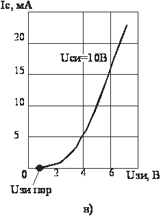 Рисунок 4 – Конструкция МДП - транзистора с индуцированным каналом n-типа (а); семейство его стоковых характеристик (б); стоко-затворная характеристика (в) Канал проводимости тока здесь специально не создается, а образуется (индуцируется) благодаря притоку электронов из полупроводниковой пластины (подложки) в случае приложения к затвору напряжения положительной полярности относительно истока. При отсутствии этого напряжения канала нет, между истоком и стоком n-типа расположен только кристалл р- типа и на одном из р-n- переходов получается обратное напряжение. В этом состоянии сопротивление между истоком и стоком очень велико, т.е. транзистор заперт. Но если подать на затвор положительное напряжение, то под влиянием поля затвора электроны будут перемещаться из областей истока и стока и из р- области (подложки) по направлению к затвору. Когда напряжение затвора превысит некоторое отпирающее, или пороговое, значение Uзи пор, то в приповерхностном слое концентрация электронов превысит концентрацию дырок, и в этом слое произойдет инверсия типа электропроводности, т.е. индуцируется токопроводящий канал n-типа, соединяющий области истока и стока, и транзистор начинает проводить ток. Чем больше положительное напряжение затвора, тем больше проводимость канала и ток стока. Таким образом, транзистор с индуцированным каналом может работать только в режиме обогащения.