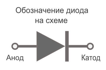 На стыке соединения P и N образуется PN-переход (PN-junction). Электрод, подключенный к P, называется анод. Электрод, подключенный к N, называется катод. Диод проводит ток в направлении от анода к катоду, и не проводит обратно. Обозначения полупроводниковых диодов состоят из шести элементов. Первый элемент — буква, указывающая, на основе какого полупроводникового материала выполнен диод. Германий или его соединения обозначают буквой Г, кремний и его соединения — буквой К, соединения галлия — А. В приборах специального назначения буквы заменяются соответствующими цифрами: германий — 1, кремний — 2, соединения галлия — 3. Второй элемент — буква, обозначающая подклассы диода:выпрямительные, импульсные, универсальные — Д, варикапы — В, туннельные и обращенные диоды — И, стабилитроны — С, сверхвысокочастотные — А. Третий элемент — цифра, определяющая назначение диода: от 101 до 399 — выпрямительные; от 401 до 499 — универсальные; от 501 до 599 - импульсные. У стабилитронов эта цифра определяет мощность рассеяния. Четвертый и пятый элементы — цифры, определяющие порядковый номер разработки (у стабилитронов эти цифры показывают номинальное напряжение стабилизации). Шестой элемент — буква, показывающая деление технологического типа на параметрические группы (приборы одного типа по значениям параметров подразделяются на группы). У стабилитронов буквы от А до Я определяют последовательность разработки, например: КД215А, ГД412А, 2Д504А, КВ101А, КС168А и т. д. У полупроводниковых диодов имеются существенные достоинства: 1. Малый вес и малые размеры. 2. Отсутствие затраты энергии на накал. 3. Большой срок службы (до десятков тысяч часов). 4. Большая механическая прочность (стойкость к тряске, ударам и другим видам механических перегрузок). 5. Различные устройства (выпрямители, усилители, генераторы) с полупроводниковыми приборами имеют высокий КПД, так как потери энергии в самих приборах незначительны. Вместе с тем полупроводниковые диоды в настоящее время обладают следующими недостатками: 1. Параметры и характеристики отдельных экземпляров приборов данного типа имеют значительный разброс. 2. Свойства приборов сильно зависят от температуры. 3. Работа полупроводниковых диодов резко ухудшается под действием радиоактивного излучения. Классификация диодов