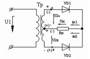 Рис. 1.6. Схема двухполупериодного выпрямителя с выводом средней точки вторичной обмотки трансформатора Двухполупериодные выпрямители применяют для питания нагрузочных устройств малой и средней мощностей. билет 10