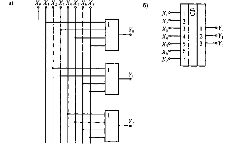 Рассмотрим принцип построения шифратора на примере преобразования 8-разрядного единичного кода в двоичный код Схема такого шифратора приведена на рис 15 3 а, а его условное схематичное обозначение — на рис 15.3 б. Если все входные сигналы имеют нулевое значение, то на выходе шифратора будем иметь нулевой код Yo=Y\=Yi=0 Младший выход, т е. выход с весовым коэффициентом, равным 1, должен возбуждаться при входном сигнале на любом из нечетных входов, так как все