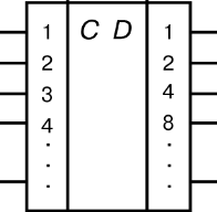 Шифраторы. Шифратор решает задачу, обратную дешифратору: на его выходных шинах устанавливается код, соответствующий номеру входа, на котором появилась логическая 1. При построении шифратора для получения натурального двоичного кода учитывают, что единицу в младшем разряде такого кода имеют нечетные десятичные цифры 1, 3, 5, 7, т.е. на выходной шине младшего разряда должна быть 1, если она есть на входной шине № 1 или на входной шине № 3 и т.д. Поэтому входные шины под указанными номерами через элемент ИЛИ соединяются с выходной шиной младшего разряда. Единицу во втором разряде двоичного кода имеют десятичные цифры 2, 3, 6, 7,...; шины с этими номерами через элемент ИЛИ должны подключаться к выходу шифратора, на котором устанавливается второй разряд кода. Аналогично шины с номерами 4, 5, 6, 7,... через элемент ИЛИ должны быть соединены с выходом, на котором устанавливается третий разряд, так как их коды имеют в этом разряде единицу, и т.д. Схема шифратора, построенная в соответствии с изложенным принципом, изображена на рис. 3.23. Условное изображение шифратора приведено на рис. 3.24. Шифраторы применяются в устройствах, преобразующих один вид кода в другой. При этом вначале дешифрируется каждая комбинация исходного кода, в результате чего на соответствующем выходе дешифратора появляется логическая 1. Затем этот логический сигнал, значение которого определено номером выхода дешифратора, подается на шифратор, и на его выходах устанавливается преобразованный код. Примером использования шифраторов являются также устройства ввода двоичных кодов в цифровое устройство с клавиатуры. При нажатии клавиши на определенной входной шине шифратора появляется логическая 1 (шина возбуждается) и на выходах устанавливается двоичный код, соответствующий нанесенному на клавишу знаку (букве, цифре и т.д.).
