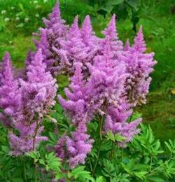 Астильба - Astilbe Семейство: камнеломковые. Травянистый, корневищный многолетник высотой до 100см. Цветки белые, розовые, красные или сиреневые собраны в метелку. Цветет с июля по сентябрь. В садоводстве сейчас насчитывается более 200 сортов имеющих гибридное происхождение на основе астильб: Арендса, Тунберга, Давида, Китайской, Корейской, Японской. Сорта различаются по высоте от низких - менее 50см. до высоких - более 80см., по цвету - от белого до темно-красного и фиолетового,а также по форме и плотности соцветий, окаске листьев, и продолжительности цветения. Астильба педпочитает влажные, рыхлые, слабокислые почвы. Тенелюбива. Большинство сортов морозоустойчиво. Желательны подкормки полным минеральным удобрением. На одном месте может расти до 10 лет и более. Размножать астильбу лучше делением куста в сентябре или в мае, а также черенкованием с частью корневища в августе. Сеянцы выращенные из семян не сохраняют сортовые признаки.