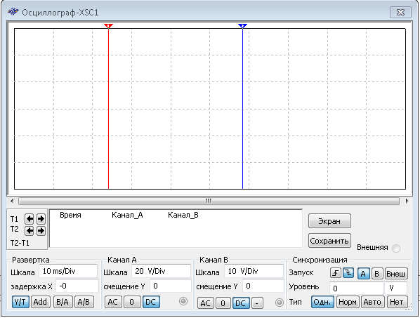 В программе Multisim 10.1.1 измерения, в том числе при произвольной форме сигналов, проводят с помощью двух и четырехканальной моделей осциллографов. Используют также модели осциллографов Tektronix и Agilent. В отличие от программы Electronics Workbench, имеющей и простую и расширенную модель осциллографа, в программе Multisim установлены только расширенные версии этих приборов. Они более точны и удобны при проведении анализа, однако занимают значительную площадь на рабочем поле приложения, что затрудняет их применение при работе со сложными моделями схем. Осциллограф включают в схему с помощью его знака, имеющего три входа: вход канала А, вход канала В и вход синхронизации. Каждый из этих входов имеет также общий вход. Настройка осциллографа (рис. в приложении) при помощи полей управления, расположенных на панели управления, для проведения измерений заключается в следующем. 1. Выбирается расположение осей, по которым откладывается исследуемый сигнал. 2. Назначается необходимый масштаб развертки по осям. 3. Производится смещение начала координат по осям. 4. Выбирается режим работы каналов по входу, открытый или закрытый. 5. Выбирается режим синхронизации, по фронту или по срезу, по каналу А или В, внутренний или внешний. Панель управления включает пять полей управления. 1. Поле управления визирами. 2. Поле управления горизонтальной разверткой. 3. Поля управления каналами А и В. 4. Поле управления синхронизацией.